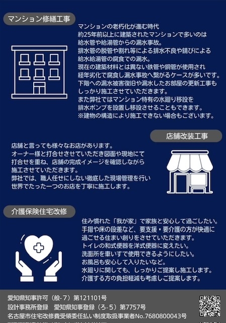 技術力によって仕上がりの正確さや美しさが違いとなってあらわれます。バスやキッチン、フローリングなどさまざまな技術が求められます。設計とプランニングの前に専任担当者がお客様のご要望を伺います。戸建てリフォーム、マンションリフォーム、店舗改修等々。大きな物件から小さなリフォーム、外構工事や設備工事も弊社へご相談ください。どんな事でも、まずはお気軽にお問い合わせください!